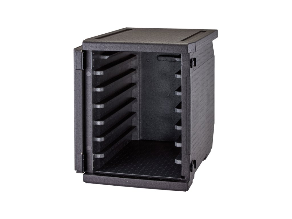 Termobox s předním plněním a 9 kolejnicemi renomovaného výrobce CAMBRO je jedním z nejlepších produktů pro přepravu pokrmů na trhu. Boxy jsou odolné a lehké, a disponují 9 vestavěnými kolejnicemi, které nelze rozšířit ani vyjmout. Kolejnice jsou přizpůsobeny pro plechy 60x40cm a mají mezeru 3,5 cm. Vestavěné rukojeti v horní části boxu ve spojení s plně otevíratelnými dvířky (270°) zajišťují jednoduchou manipulaci i nakládku a vykládku pokrmů. Termoboxy jsou stohovatelné, odolné vůči mastnotě či chemikáliím a lze je mýt v myčce nádobí. Lze je použít i s ohřívacími a chladícími vložkami, které se vkládají na zadní stranu boxu, což zabraňuje odkapávání kondenzované vody na pokrmy a zároveň zajišťuje rovnoměrné rozložení tepla či chladu v celém boxu.