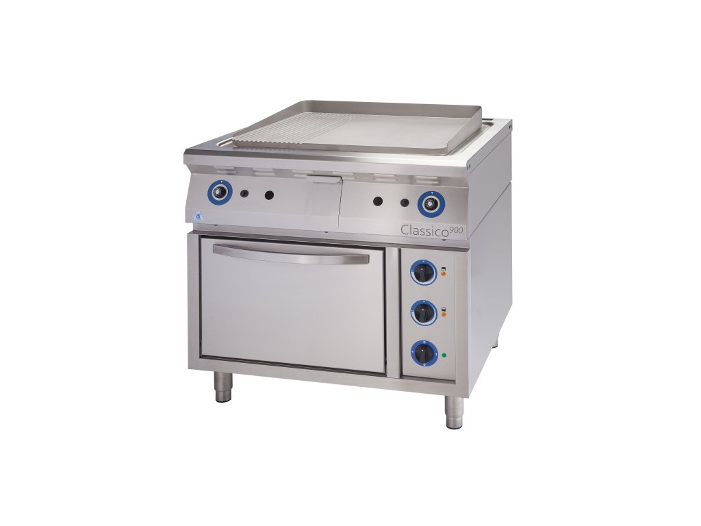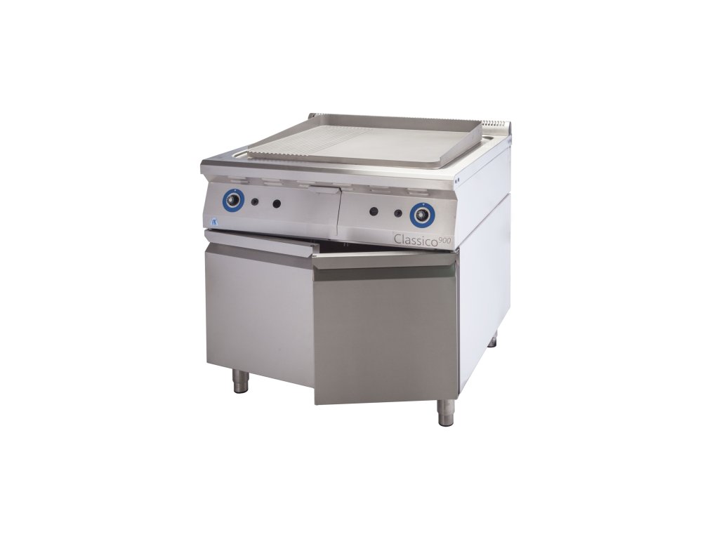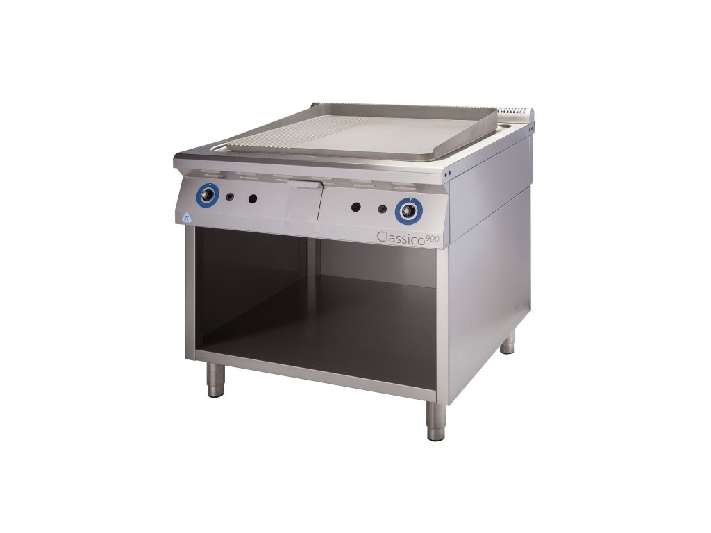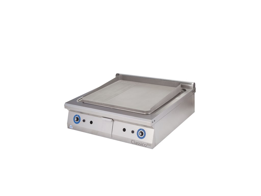 Celonerezová konstrukce z kvalitní potravinářské oceli AISI 304 - EN 1.4301. Materiál desky: nerezová ocel s příměsí titanu AISI 321 - EN 1.4541 se zvýšenou odolností. Velkoobjemová odkapní nádoba - 2,6 l. Síla grilovací desky - 12 mm. Dvě regulovatelné topné zóny. Žlábek s otvorem pro odtok tuků do výsuvné odkapní nádoby uprostřed předního krytu. Podstavce v několika variantách, vždy opatřeny všemi seřizovatelnými nožičkami.Doplňkové parametry