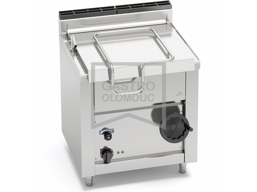 Elektrická a plynová pánev s obsahem 60 litrů se speciálním fixačním systémem vyklápění do 80°, vybavena mikrospínačem pro zastavení chodu
