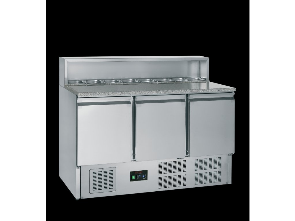 Stoly na pizzu ze série G-line jsou fantastické pro přípravu pizzy. Vše potřebné máte na dosah. Vyskládejte různé ingredience do gastronádob GN 1/6 a použijte vnitřní prostor pro skladování a snadné doplňování. Žulová deska stolu je ideální pro přípravu lahodného pizza těsta, protože zůstává chladná a těsto se tolik nelepí na desku stolu.prověřená kvalita za příznivou cenu|žulová pracovní deska|automatické odmrazování|dveře|nastavitelné nožky|nerezové provedení|chlazení s pomocným ventilátorem