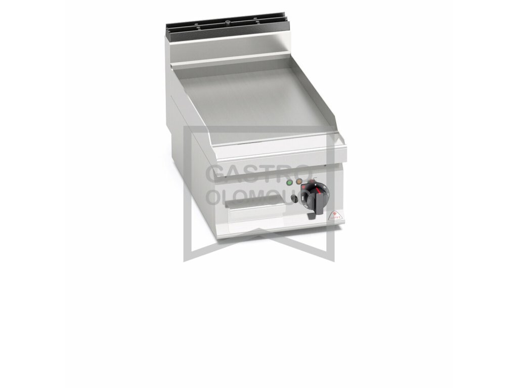 Zesílená grilovací deska s hladkým (rýhovaným) povrchem z oceli a zvýšenými postranními lemy. Topné těleso je umístěno pod grilovací plotnou. Regulační stupně umožňují nastavit teplotu 50-300°C