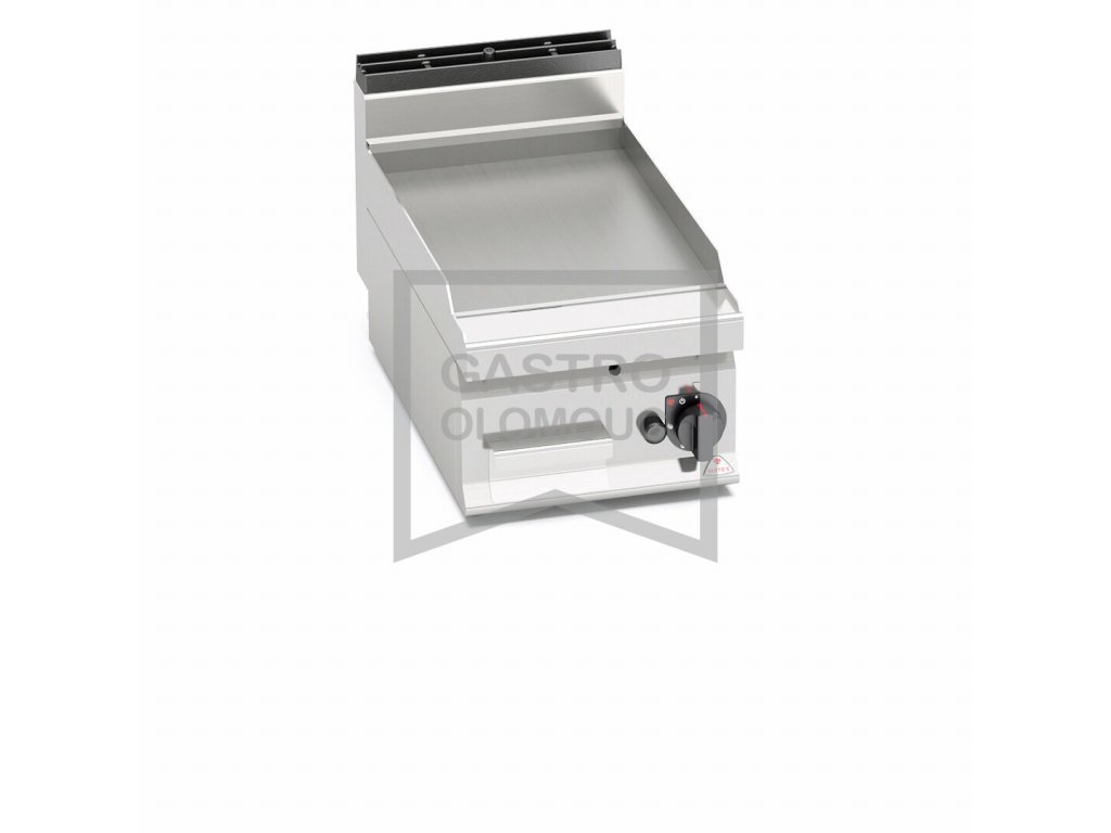 Termostatický ventil do 300°C pro přesnou a bezpečnou regulaci. Deska s hladkým (rýhovaným) povrchem z oceli a zvýšenými postranními lemy.