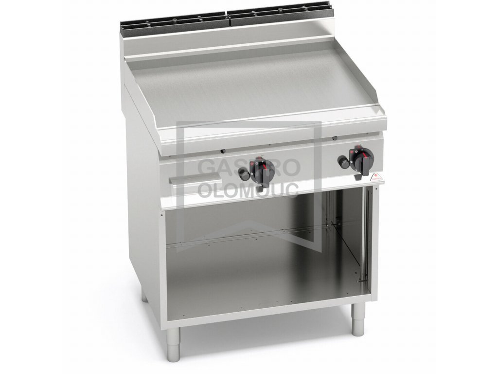Ocelová grilovací plotna je v hladkém provedení "FL" (volitelně i v rýhovaném "FR" nebo kombinovaném "FM" provedení) a zvýšenými postranními lemy.