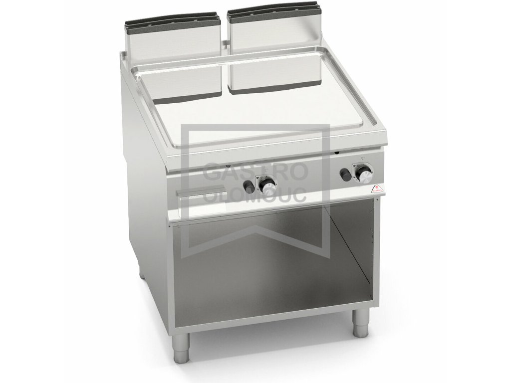 Termostatický ventil 30 až 300°C pro přesnou a bezpečnou regulaci. Termočlánek a chráněný zápalný plamínek. Dvě zóny s nezávislým ovládáním a přesnou regulací teploty. Dvojvrstvá grilovací plotna složená z ocelového plátu a horní vrstvy z nerez oceli AISI 316 s leštěným povrchem, který umožňuje snadné čištění. Nízká úroveň odlesku zvyšuje komfort při práci. Zvýšené postranní lemy. Kompaktní provedení s otevřeným podstavcem. Zvýšený odtah 120 mm není součástí ! Kompletní sortiment plynových a elektrických ploten s různým provedením grilovací plochy. Lze na nich připravovat pokrmy tzv. "kontaktem" a to nejcitlivějším způsobem. Jednotný systém distribuce tepla zaručuje rovnoměrné grilování po celé pracovní ploše, velké energetické úspory a zlepšení pracovního prostředí. Při grilování se přirozeně tvoří zbytkový olej, který je odváděn a shromažďován ve velké odpadní nádobce. Teflonová zátka, odolná vůči vysokým teplotám není součástí smažící plotny.