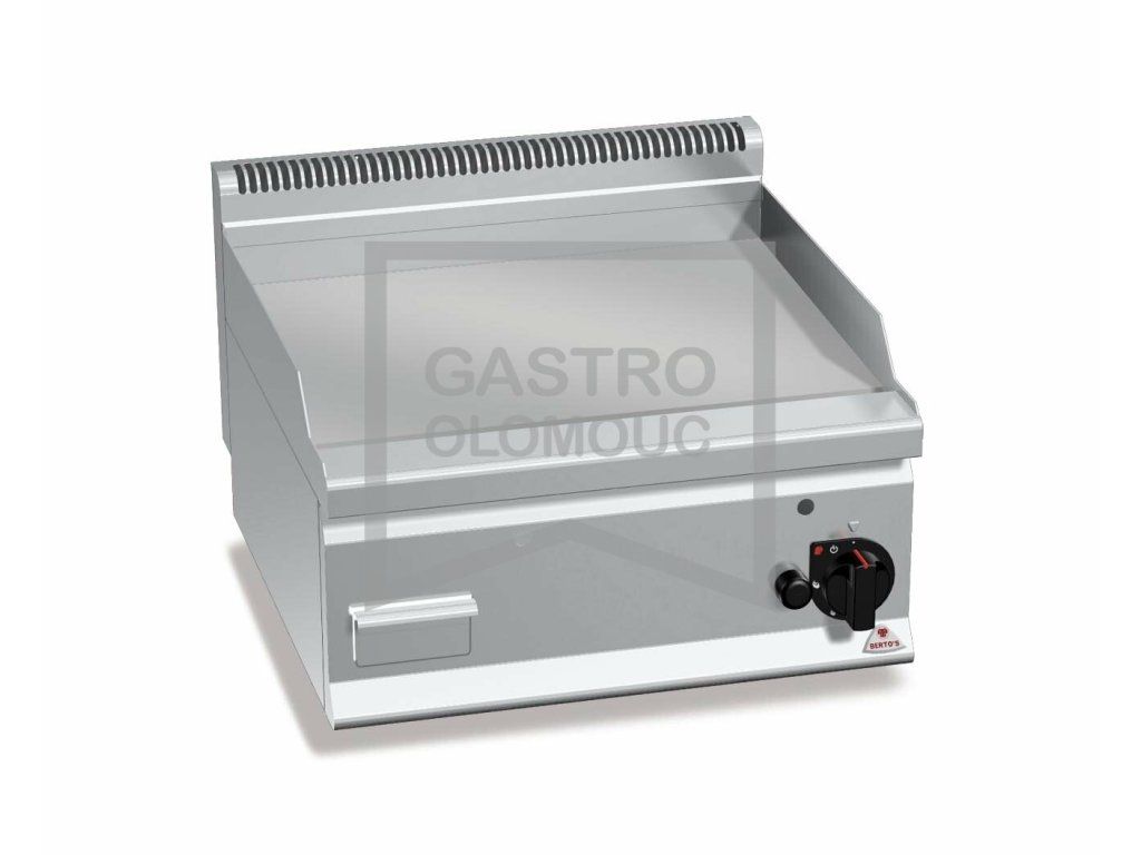 Termostatický ventil 30 až 300°C pro přesnou a bezpečnou regulaci. Termočlánek a chráněný zápalný plamínek. Deska s hladkým (rýhovaným nebo kombinovaným) povrchem z oceli a zvýšenými postranními lemy.