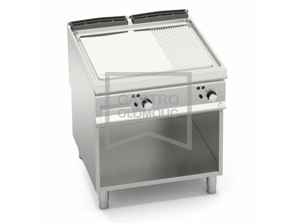 Topné těleso z oceli Incoloy s obzvlášť velkým průměrem je umístěno pod grilovací plotnu. Dvě zóny s nezávislým ovládáním a přesnou regulací teploty. Dvojvrstvá grilovací plotna složená z ocelového plátu a horní vrstvy z nerez oceli AISI 316 s leštěným povrchem, který umožňuje snadné čištění. Nízká úroveň odlesku zvyšuje komfort při práci. Zvýšené postranní lemy. Kompaktní provedení s otevřeným podstavcem. Kompletní sortiment plynových a elektrických ploten s různým provedením grilovací plochy. Lze na nich připravovat pokrmy tzv. "kontaktem" a to nejcitlivějším způsobem. Jednotný systém distribuce tepla zaručuje rovnoměrné grilování po celé pracovní ploše, velké energetické úspory a zlepšení pracovního prostředí. Při grilování se přirozeně tvoří zbytkový olej, který je odváděn a shromažďován ve velké odpadní nádobce. Teflonová zátka, odolná vůči vysokým teplotám není součástí smažící plotny.