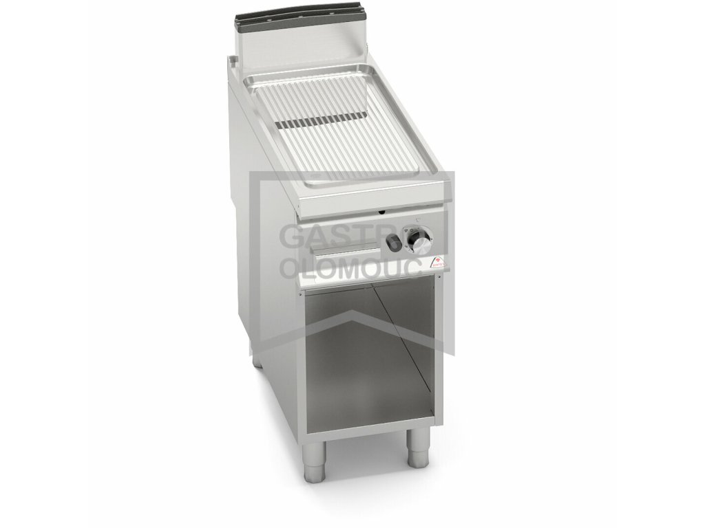 Termostatický ventil 30 až 300°C pro přesnou a bezpečnou regulaci. Termočlánek a chráněný zápalný plamínek. Dvojvrstvá grilovací plotna složená z ocelového plátu a horní vrstvy z nerez oceli AISI 316 s leštěným povrchem, který umožňuje snadné čištění. Nízká úroveň odlesku zvyšuje komfort při práci. Zvýšené postranní lemy. Kompaktní provedení s otevřeným podstavcem. Zvýšený odtah 120 mm není součástí ! Kompletní sortiment plynových a elektrických ploten s různým provedením grilovací plochy. Lze na nich připravovat pokrmy tzv. "kontaktem" a to nejcitlivějším způsobem. Jednotný systém distribuce tepla zaručuje rovnoměrné grilování po celé pracovní ploše, velké energetické úspory a zlepšení pracovního prostředí. Při grilování se přirozeně tvoří zbytkový olej, který je odváděn a shromažďován ve velké odpadní nádobce. Teflonová zátka, odolná vůči vysokým teplotám není součástí smažící plotny.