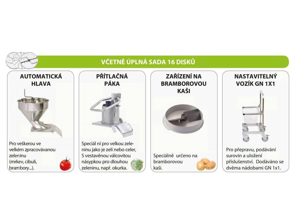 - určeny pro velké gastronomické provozy, velkokapacitní jídelny, výrobny lahůdek a další gastronomické provozy s požadavkem na kvalitní a výkonné zpracování zeleniny s max. denní kapacitou 1000 porcí