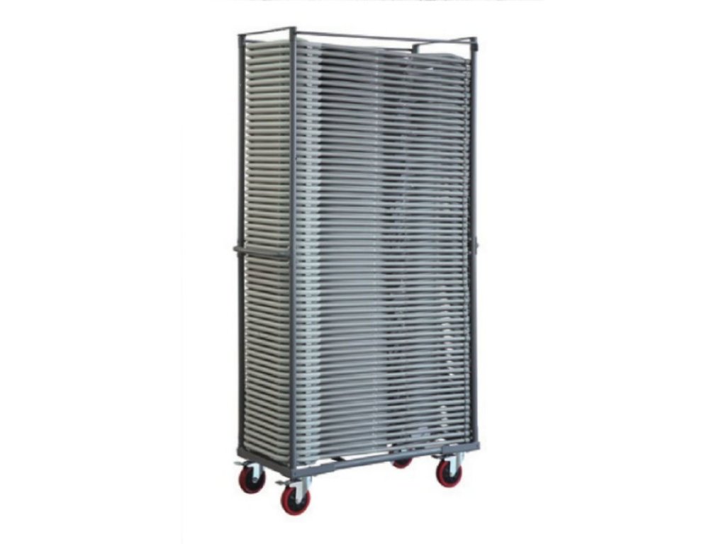 Výška: 196,8 cm, rozměr: 95,4 x 47,5 cm. Snadné skládání. Nosnost 60 ks. 2x brzděná kolečka.