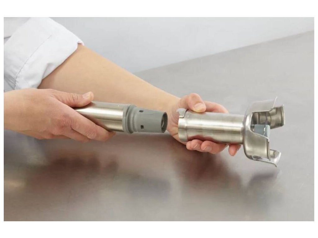 [*W_New cable.jpg>] *** Nové provedení přívodního kabelu * Nový patentovaný systém „Easy Plug“ – odmontovatelný přívodní kabel pro snazší výměnu kabelů a delší životnost. * Nový systém navíjení přívodního kabelu – čep na motorovém bloku umožňuje jednodušší navíjení, prodlužuje životnost a rovněž slouží jako podpěra na okraji nerez nádoby pro lepší manipulaci. * kontrolka na na rukojeti signalizuje správné zacvaknutí přívodní šňůry v rukojeti *Odnímatelná noha, rozebíratelný nůž a zvon umožňují snadné čištění a dosažení perfektní hygieny. * Nůž, zvon a noha z nerezové oceli pro delší životnost. * Mixovací nerez nůž pro přípravu polévek, hustých polévek a omáček. * EBS systém – elektronický systém zajišťující optimální výkon motoru. * Dvojitá ergonomická rukojeť pro lepší použití. * Doporučuje se používat spolu s držákem k upevnění k nádobě.