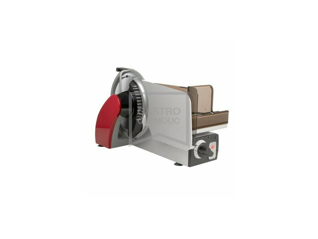 Nářezový stroj manuální pro profesionální použití na porcování a krájení různých produkt (uzeniny, maso, sýr, chléb, zeleninu a ovoce). Vhodný pro gastronomické provozy a menší prodejny. Opravdový multitalent se šírokým spektrem využití. Promyšlená konstrukce stroje zabezpečí nejlepší výsledky krájení, optimální přístup a komfort při čistění. Vysoký hygienický standard. Účinný systém chlazení motoru a hybridní pohon (šneková převodovka pohánějící klínový řemen) umožňuje efektivní a bezúdržbový přenos energie i při nepřetržitém provozu. Důmyslný "L" design umožňuje šikovnou kombinaci a těsné seskupení s úložnými tácky, krájecími deskami, nebo s váhou atd. Maximální řezná kapacita s minimální stopou, přesné a praktické nastavení tloušťky řezu od 0 až do 20mm.