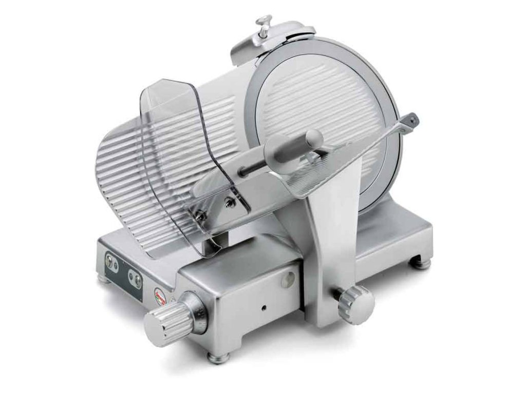Nářezový stroj CANOVA 275 TOP s teflonovým nožem o průměru 275 mm s uložením posuvného stolu našikmo, od italského výrobce SIRMAN.