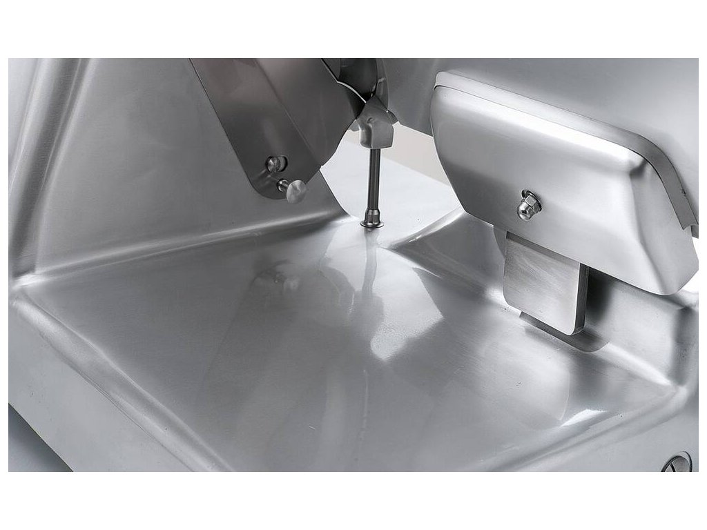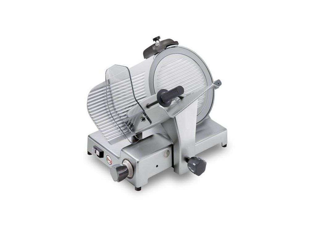 Nářezový stroj CANOVA 275 s nožem o průměru 275 mm s uložením posuvného stolu našikmo, od italského výrobce SIRMAN.
