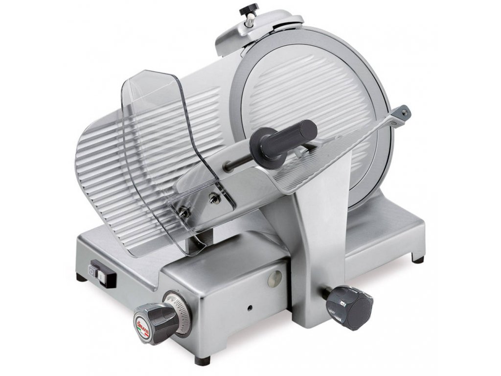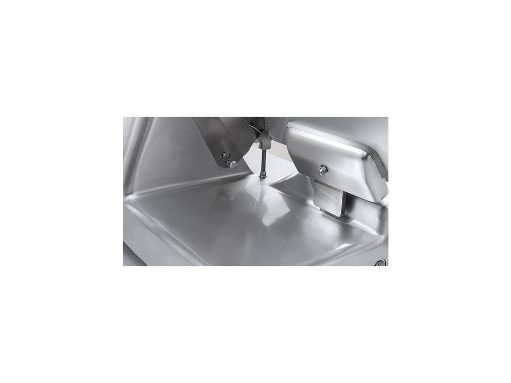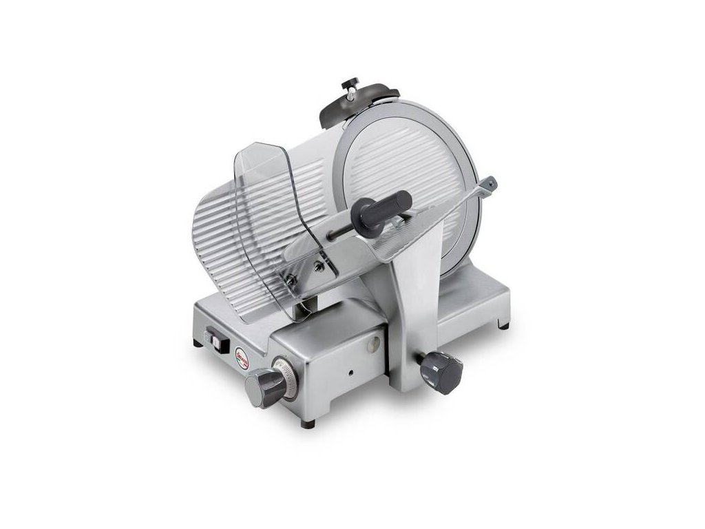 Nářezový stroj CANOVA 300 s teflonovým nožem o průměru 300 mm s uložením posuvného stolu našikmo, od italského výrobce SIRMAN.