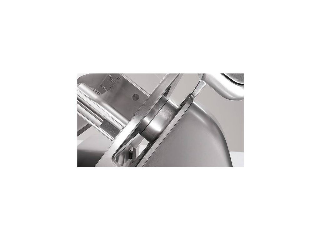 Nářezový stroj CANOVA 300 s nožem o průměru 300 mm s uložením posuvného stolu našikmo, od italského výrobce SIRMAN.