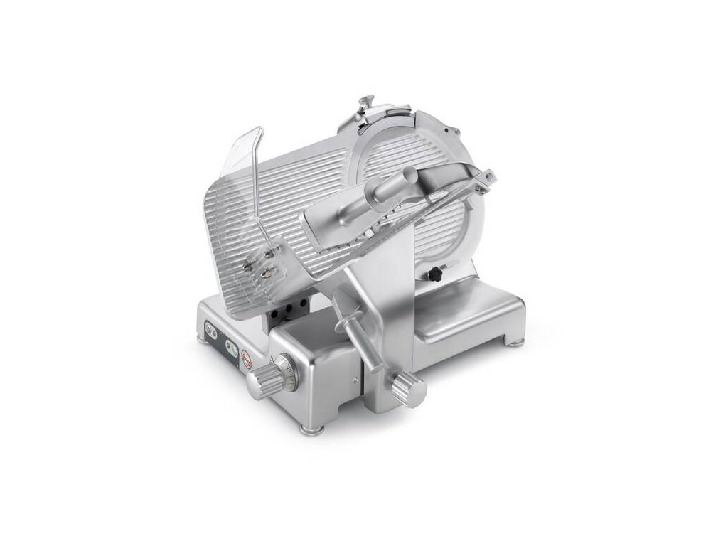 Nářezový stroj GALILEO 350 EVO INGR TOP s nožem o průměru 350 mm s uložením posuvného stolu našikmo, od italského výrobce SIRMAN.