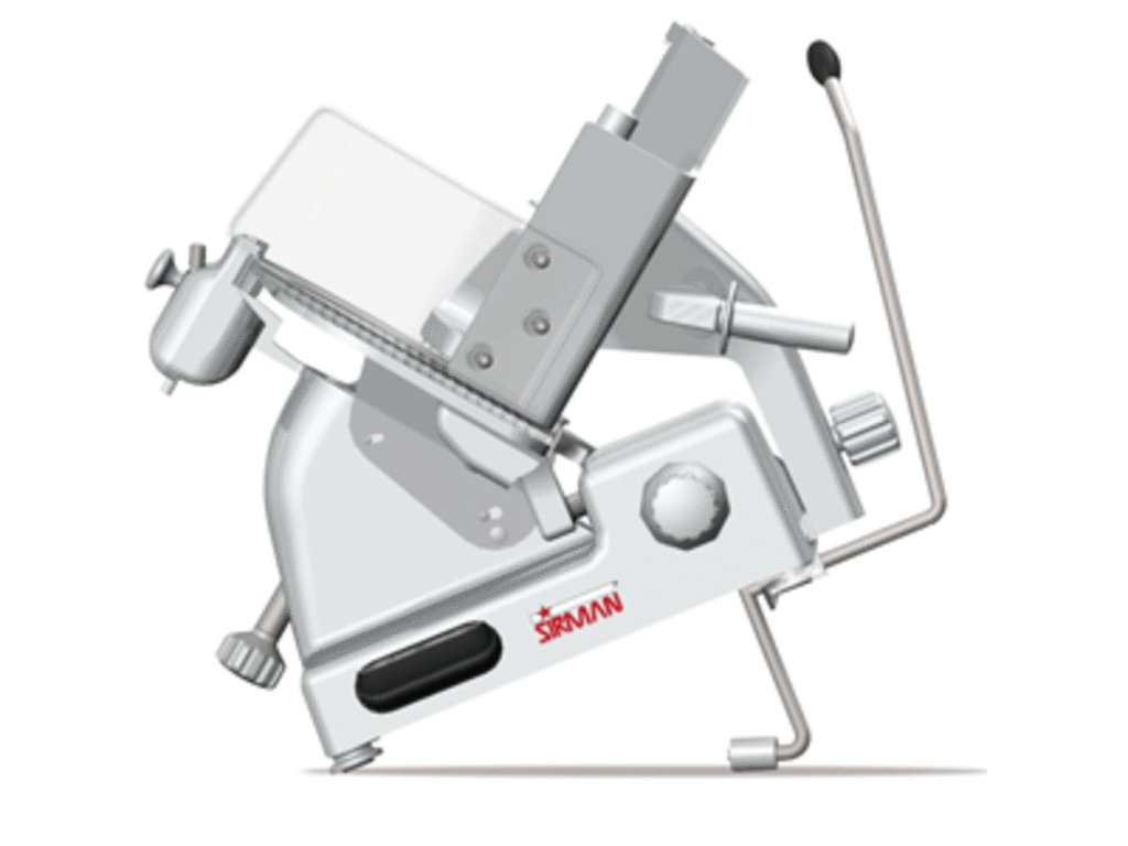 Nářezový stroj GALILEO 370 EVO TOP s nožem o průměru 370 mm s uložením posuvného stolu našikmo, od italského výrobce SIRMAN.
