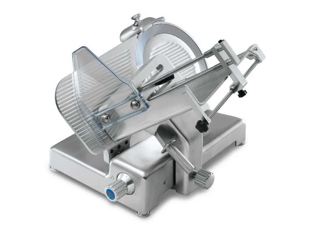 Nářezový stroj GALILEO Automatica 350 EVO TOP s nožem o průměru 350 mm s uložením posuvného stolu našikmo a automatickým posunem stolu, od italského výrobce SIRMAN.