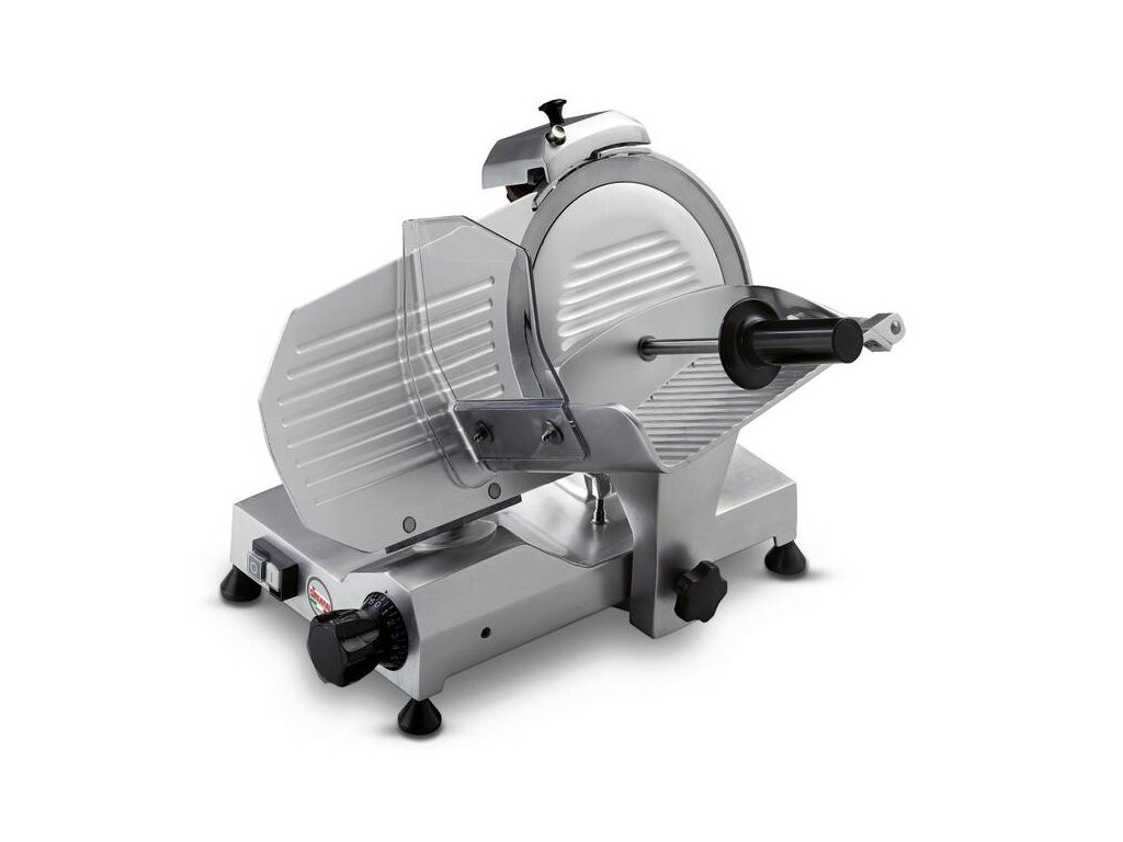 Nářezový stroj MIRRA 250 C s nožem o průměru 250 mm s uložením posuvného stolu našikmo, od italského výrobce SIRMAN.