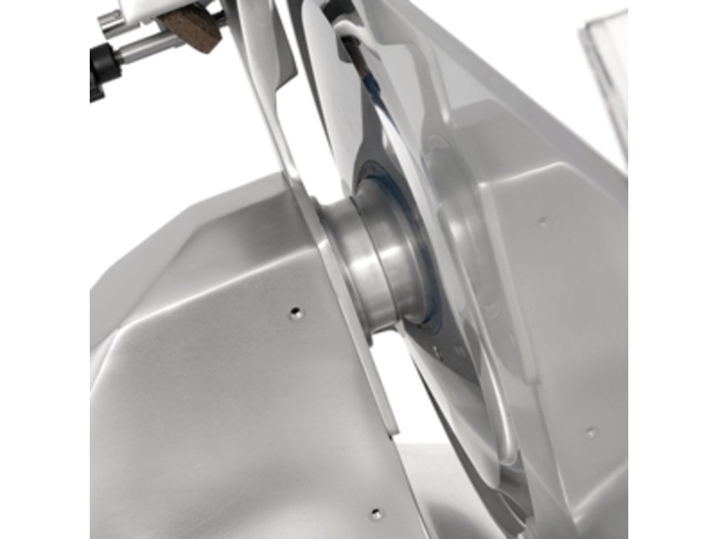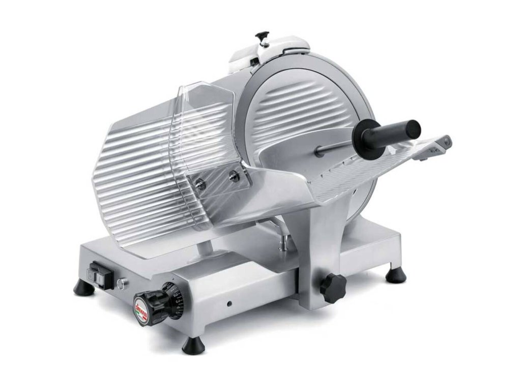 Nářezový stroj MIRRA 300 Y009 s nožem o průměru 300 mm s uložením posuvného stolu našikmo, od italského výrobce SIRMAN.