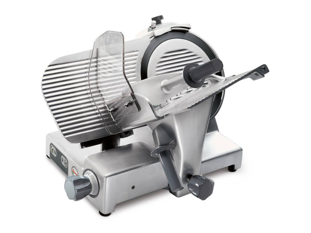 Nářezový stroj PALLADIO 330 s teflonovým nožem o průměru 330 mm s uložením posuvného stolu našikmo.