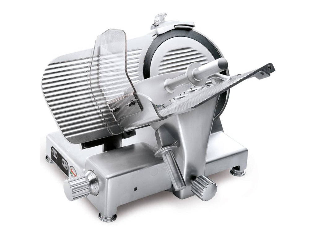 Nářezový stroj PALLADIO 330 INGR TOP s nožem o průměru 330 mm s uložením posuvného stolu našikmo, od italského výrobce SIRMAN.
