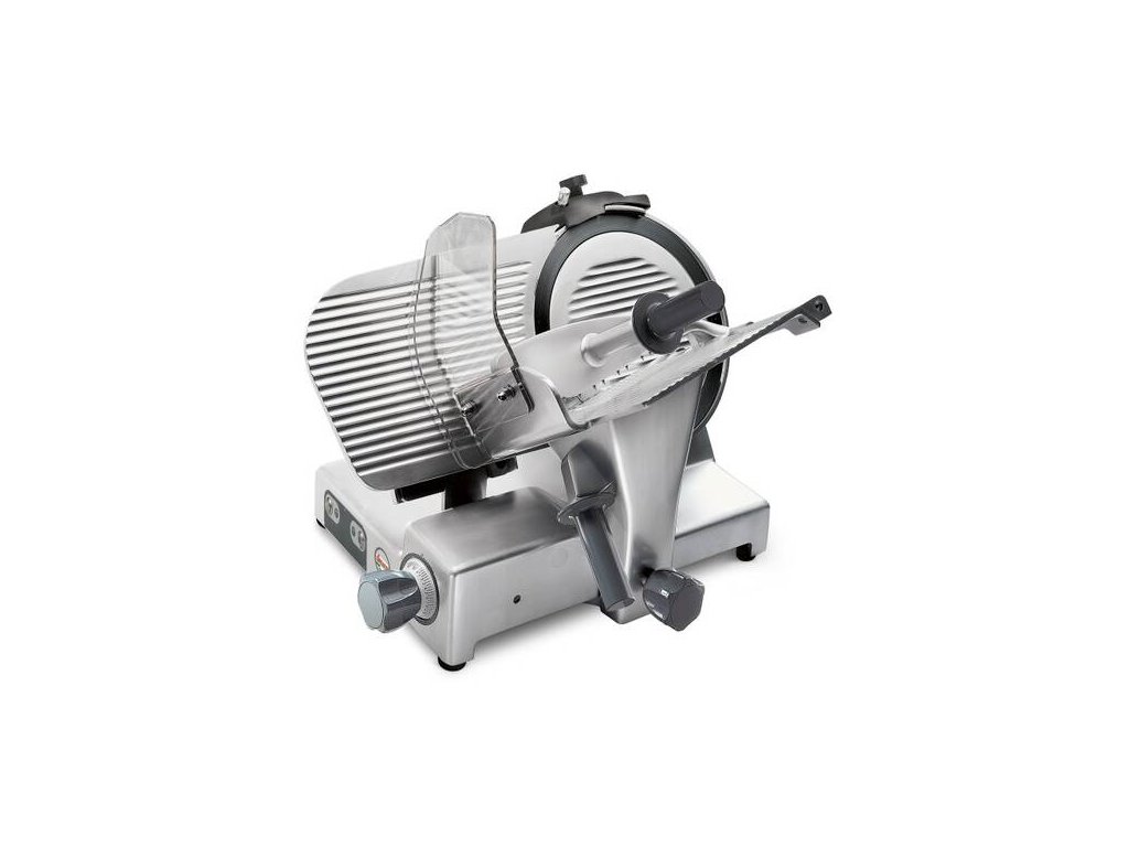Nářezový stroj PALLADIO 350 s nožem o průměru 350 mm s uložením posuvného stolu našikmo, od italského výrobce SIRMAN.
