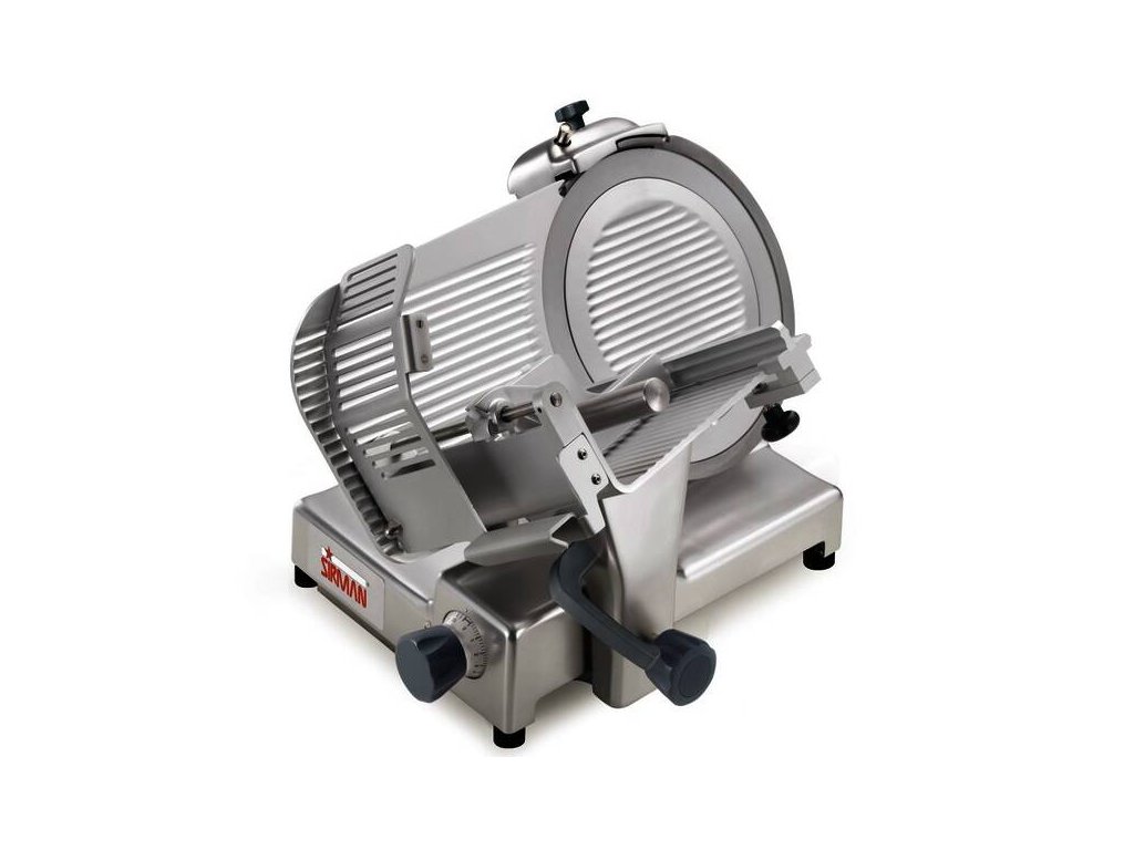 Nářezový stroj PALLADIO AUTOMATICA 300 s nerezovým nožem o průměru 300 mm s uložením posuvného stolu našikmo, od italského výrobce SIRMAN.