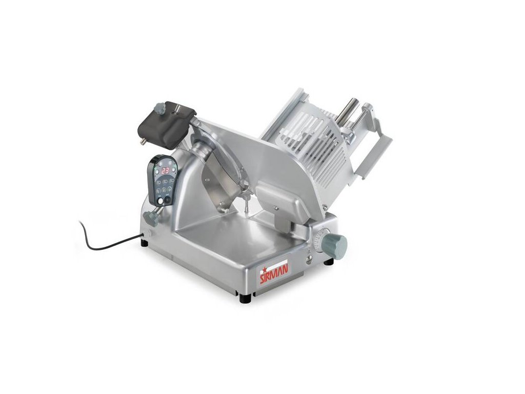 Nářezový stroj PALLADIO AUTOMATICA 300 s teflonovým nožem o průměru 300 mm s uložením posuvného stolu našikmo, od italského výrobce SIRMAN.