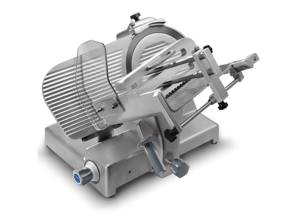 Nářezový stroj PALLADIO AUTOMATICA 330 s nerezovým nožem o průměru 330 mm s uložením posuvného stolu našikmo, od italského výrobce SIRMAN.