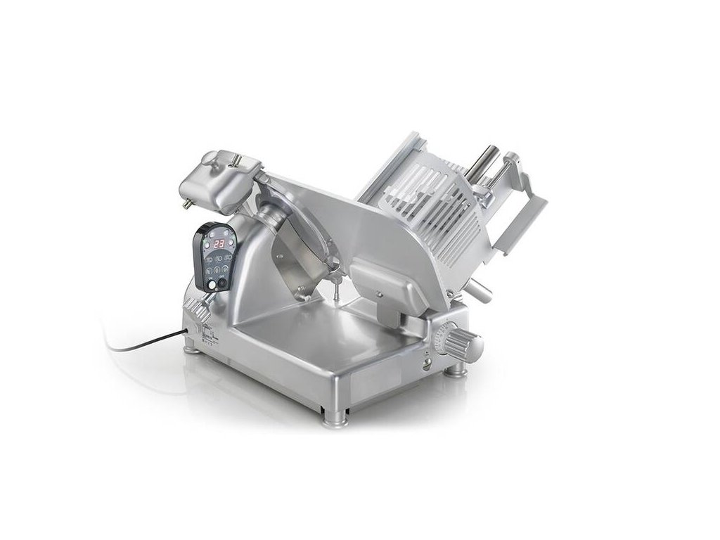Nářezový stroj PALLADIO AUTOMATICA 350 TOP s nerezovým nožem o průměru 350 mm s uložením posuvného stolu našikmo, od italského výrobce SIRMAN.
