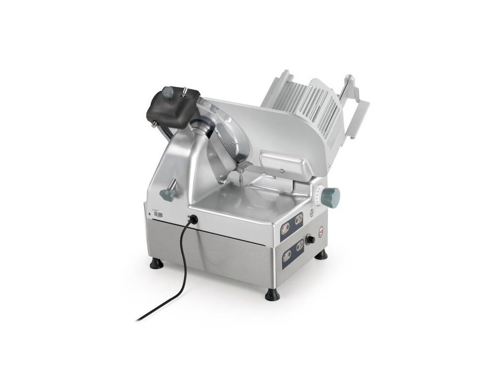 Nářezový stroj PALLADIO AUTOMEC 300 s nerezovým nožem o průměru 300 mm s uložením posuvného stolu našikmo, od itaslkého výrobce SIRMAN.