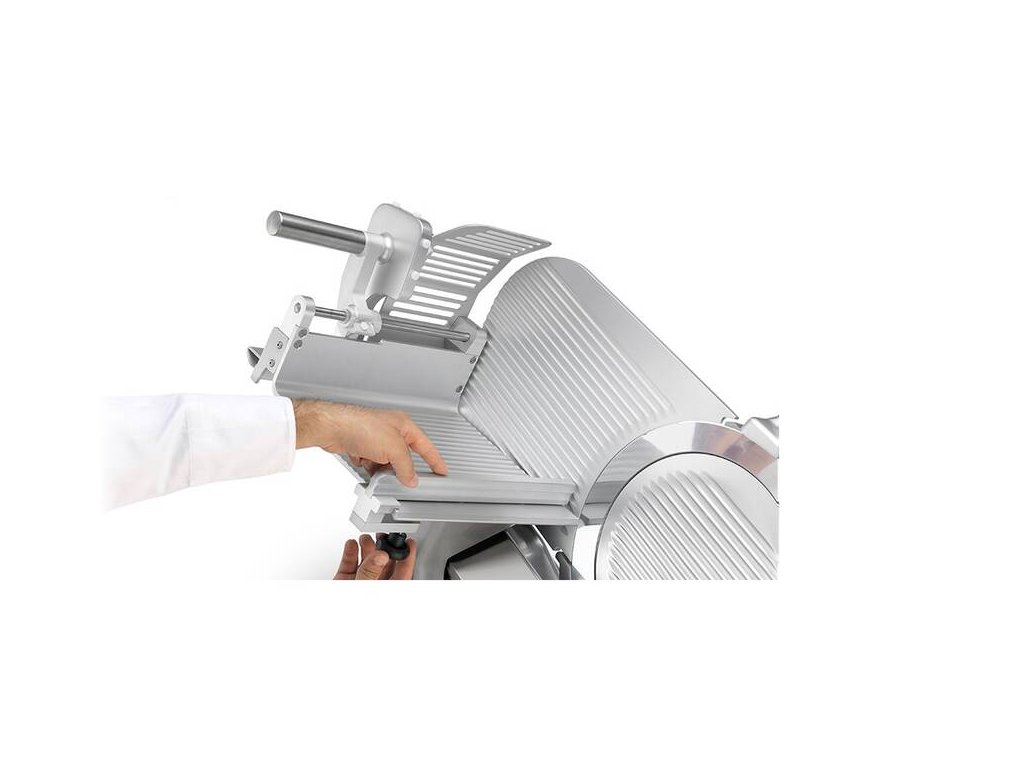- model je vybaven automatickým pojezdem, který umožňuje automatické krájení upevněné suroviny bez nutnosti manuálního posuvu pojezdového stolu obsluhou, nářezový stroj tak automaticky krájí bez nutnosti zásahu obsluhy v průběhu krájení