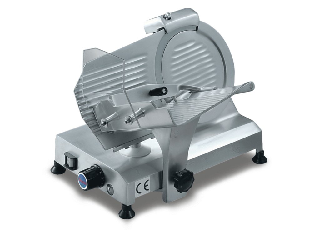 Nářezový stroj TOPAZ 250 C s nožem o průměru 250 mm s uložením posuvného stolu našikmo, od italského výrobce SIRMAN.