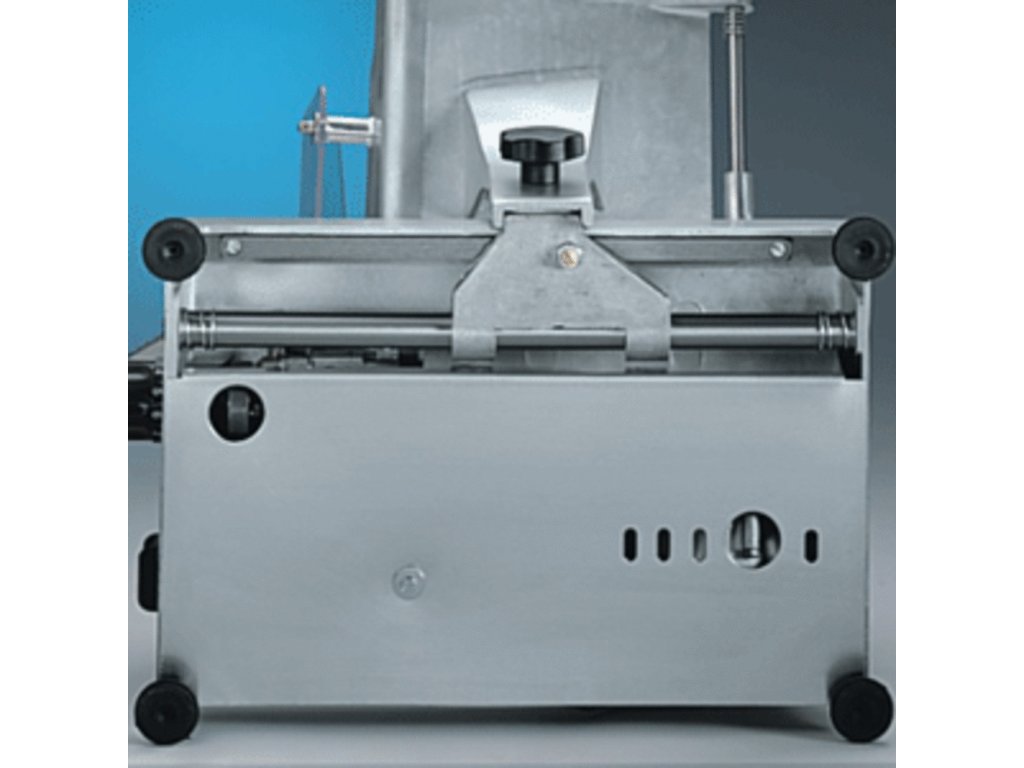 Nářezový stroj TOPAZ 275 s nožem o průměru 275 mm s uložením posuvného stolu našikmo, od italského výrobce SIRMAN.