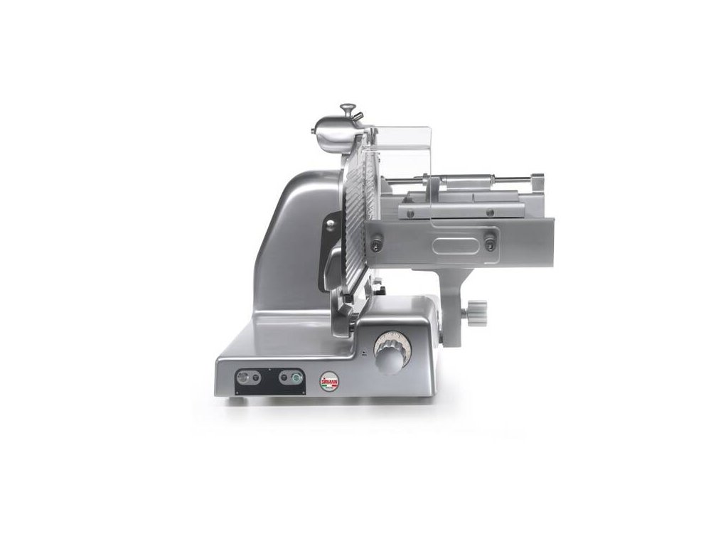 Nářezový stroj LEONARDO EVO 350 VCS TOP s nožem o průměru 350 mm s uložením posuvného stolu rovně, od italského výrobce SIRMAN.