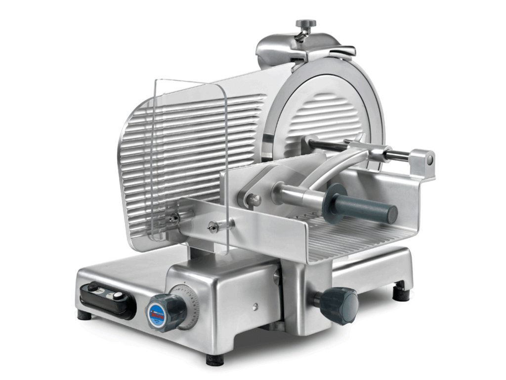 Nářezový stroj MANTEGNA 300 BS s nožem o průměru 300 mm s uložením posuvného stolu rovně, od italskéh ovýrobce SIRMAN.