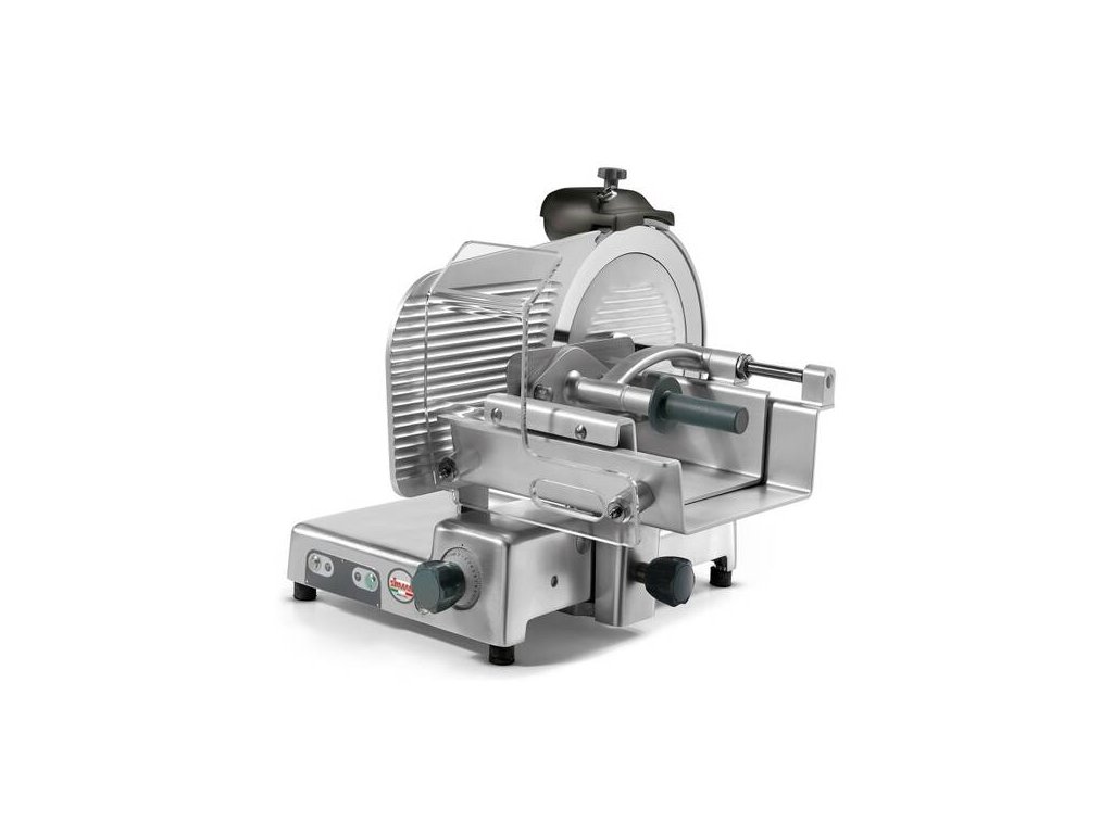 Nářezový stroj MANTEGNA 300 BS s nožem o průměru 300 mm s uložením posuvného stolu rovně, od italskéh ovýrobce SIRMAN.