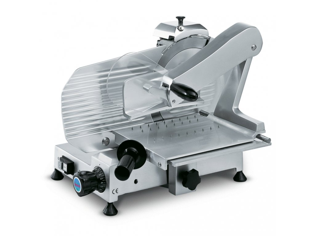 Nářezový stroj MIRRA 275 C VAS B.S. s teflonovým nožem o průměru 275 mm s uložením posuvného stolu rovně, od italského výrobce SIRMAN.