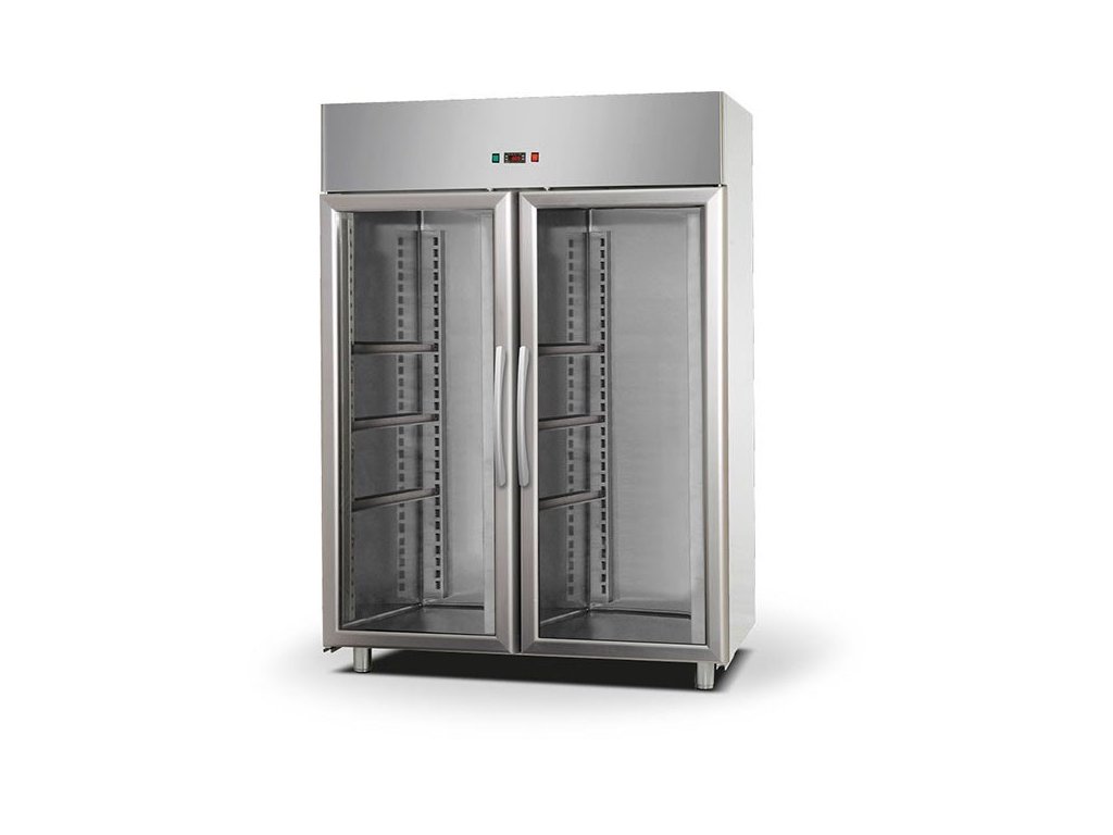 Celonerezová dvoudveřová chladicí skříň s prosklenými dveřmi.Vlastnosti: