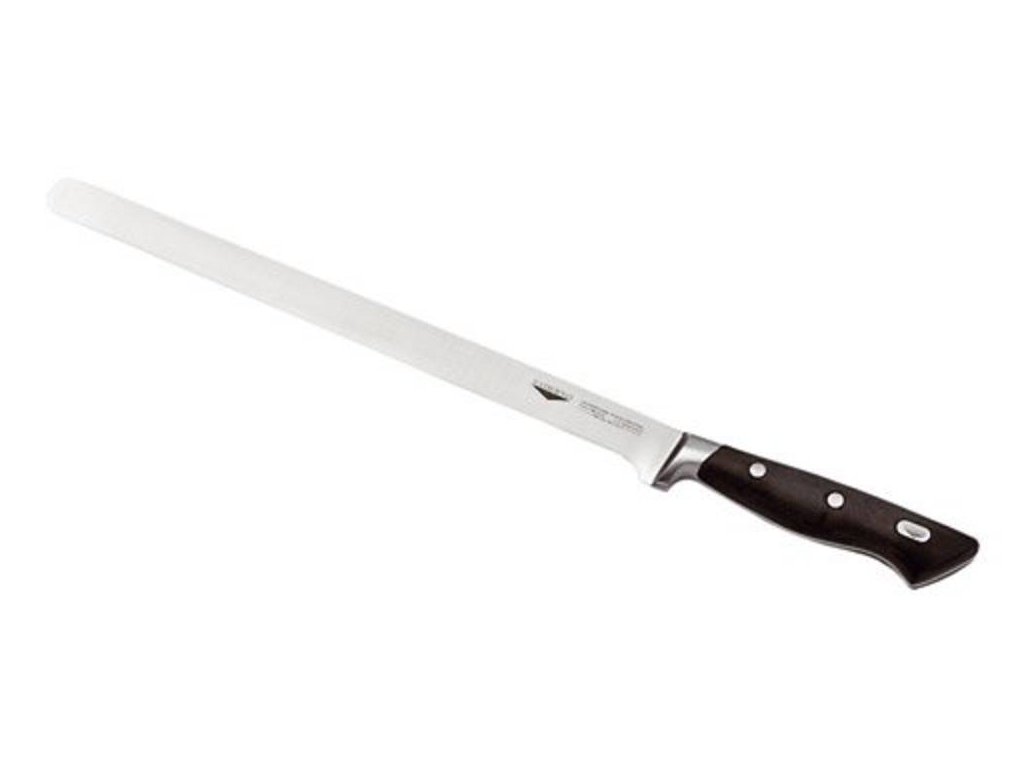 Nůž na lososa s rukojetí z odolného a protiskluzového plastu. Ostří je vyrobeno ze speciální oceli a molybdenu/vanadu. Díky zvláštnímu procesu kalení, zaručuje výrobku přesný řez a dluhou životnost ostří hrany.