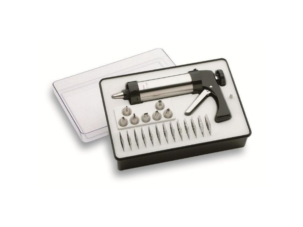 Zdobící cukrářská pistole v provedení nerez + plast. V sestavě 13 disků a 7 zdobících koncovek. Objem pistole 0,25l.
