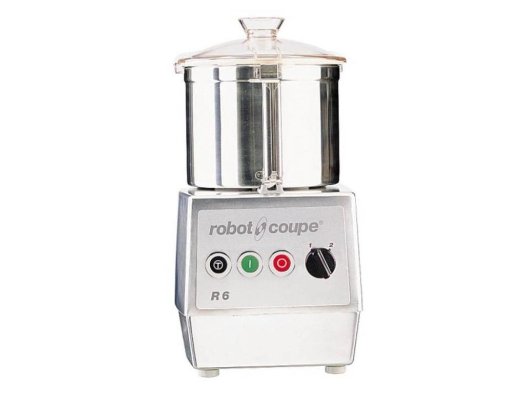 Stolní kutr R 6 A od francouzského výrobce ROBOT COUPE.Určen pro menší gastronomické provozy – restaurace, bistra, lahůdkářství a cukrárny s max. denní kapacitou do 100 porcí.Umožňuje zp Stolní kutr R 6 A od francouzského výrobce ROBOT COUPE.Určen pro menší gastronomické provozy – restaurace, bistra, lahůdkářství a cukrárny s max. denní kapacitou do 100 porcí.Umožňuje zpracování masa, zeleniny a ovoce, přípravu těsta, paštik, majonéz, pyré, pomazánek a strouhanky a rovněž sekání bylinek a koření a drcení ořechů a mandlí.MOTOROVÝ BLOKindukční motorasynchronní motor pro profesionální použití zaručující delší životnost a spolehlivost stroje; tichý chod motoru bez jakýchkoliv vibrací, motor nevyžaduje žádnou údržbu,nerezová hřídel,magnetický bezpečnostní systém, zajišťující při nesprávném sesazení zařízení nebo v momentu otevření víka zastavení, popř. nespuštění kutru.2 regulace rychlosti.Pulsní tlačítko pro lepší kontrolu konzistence a větší přesnost zpracování.Kryt motorového bloku je kovový.NÁDOBA KUTRUOdnímatelná nádoba z nerezu s ergonomickým držadlem.Lze v ní sekat maso, zeleninu, mandle, oříšky, koření, připravovat majonézu, pyré, protlaky, pomazánky, strouhanku a hnětat těsto.Průhledné polykarbonátové víko s otvorem umožňuje přidávání dalších ingrediencí v průběhu sekání.Standardní vybavení:nerezová nádoba,nůž s rovným ostřím – vhodný pro přípravu emulzí, pěn, pomazánek, pro jemné i hrubé rozsekání masa a zeleniny Lze doobjednat: nůž s jemným zubatým ostřím – pro nejjemnější zpracování – sekání zeleného koření a bylinek,nůž s hrubým zubatým ostřím – hnětení, sekání oříšků, mandlí, pro zmrzlé potraviny a ostatní tvrdé potravinyDoplňkové parametry