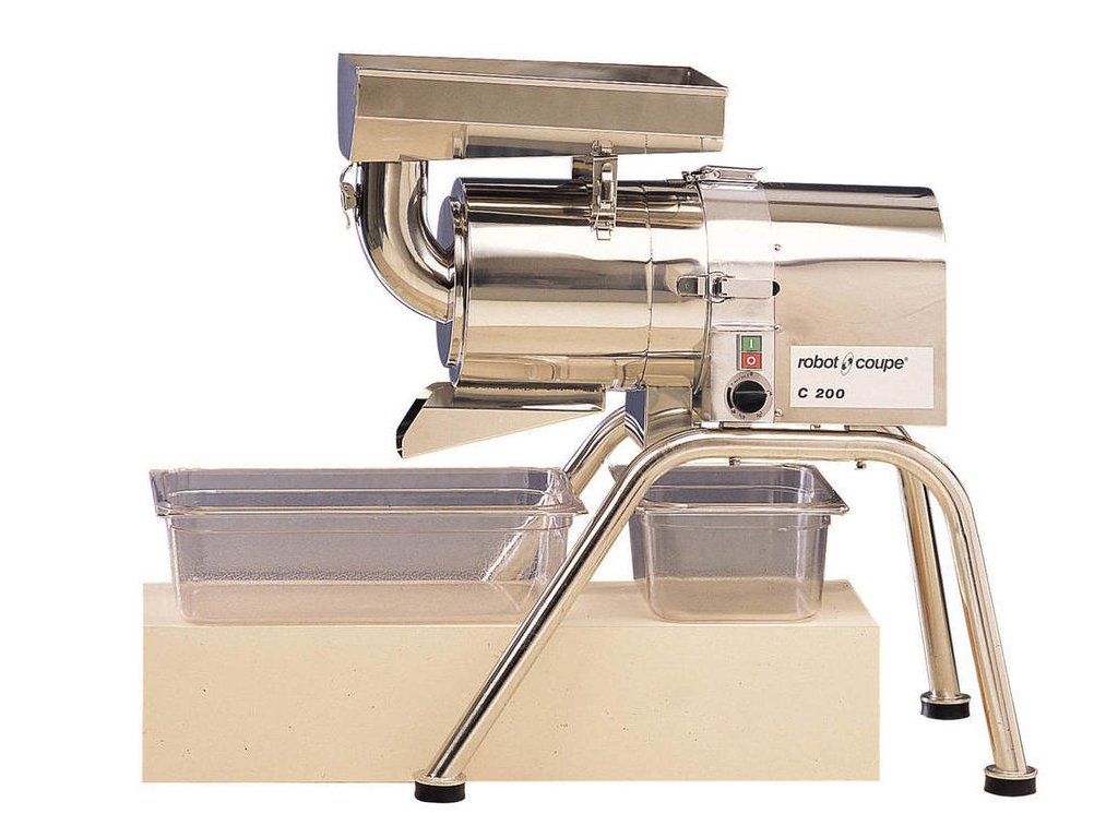 Automatický elektrický odšťavňovač, síto C 200 slouží pro přípravu šťáv, dření, pěn, omáček, polévek a rybích polévek.Hodinový výkon od 120 kg do 150 kg závislý na typu přípravy. Automatický elektrický odšťavňovač, síto C 200 slouží pro přípravu šťáv, dření, pěn, omáček, polévek a rybích polévek.Hodinový výkon od 120 kg do 150 kg závislý na typu přípravy.Stroj C 200 je vybaven 1800 W motorem pro zpracování složitějších produktů jako např. černý rybíz, a tím zaručuje delší non-stop proces zpracování a intenzivnější použití. Určen pro zpracování tvrdých produktů.Odšťavnění surovin na principu sentrifugy, za pomoci speciálního bubnového otočného síta.Bez přítlačného kolíku.Nerezové nožičky.Všechny díly C 200 jsou vyrobeny z nerezové oceli, tím je zaručena vyšší spolehlivost a snadné čištění. Díly jsou snadno rozebíratelné a lze je mýt v myčce.Umožňuje souvislé dávkování pro snadné použití a úsporu času.Je vybaven snadno sestavitelnými lopatkami.Tyto lopatky jsou vyrobeny z gumy, aby se zabránilo jakémukoliv rozmělnění kosti nebo skořápky, což zbavuje pokrm hořkosti a přináší delší trvanlivost.Magnetická bezpečnostní pojistka zabraňuje přístupu k sítu za provozu.Standardní vybavení: * síto s oky o průměru 1 mm, * síto s oky o průměru 3 mm; Lze doobjednat:Doplňkové parametry