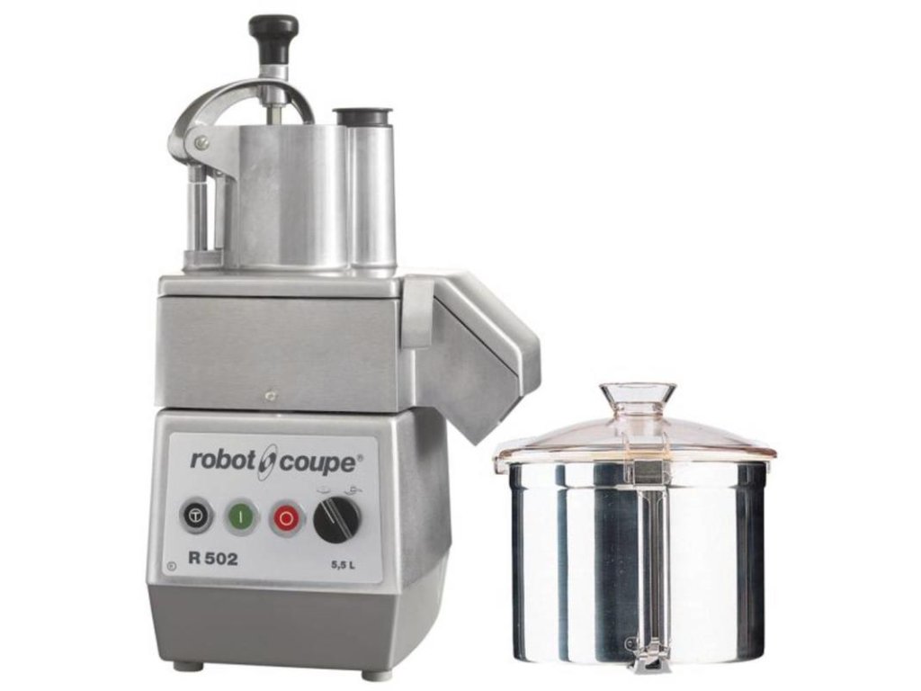 Kombinovaný robot R 502 od francouzského výrobce ROBOT COUPE.Výkonný robot vhodný pro použití ve větších provozech – v restauracích, bistrech, hotelech, školách a dalších s max. denní kapacitou do 300 porcí. Kombinovaný robot R 502 od francouzského výrobce ROBOT COUPE.Výkonný robot vhodný pro použití ve větších provozech – v restauracích, bistrech, hotelech, školách a dalších s max. denní kapacitou do 300 porcí.Výhodou kombinovaného zařízení je spojení dvou funkcí v jednom přístroji: funkce krouhače zeleniny – krouhání zeleniny pomocí krouhacího nástavce a funkce kutru – různé formy sekání, míchání a hnětení v nádobě kutru, který je standardně vybaven nožem s rovným ostřím.MOTOROVÝ BLOKindukční motorasynchronní motor pro profesionální použití zaručující delší životnost a spolehlivost stroje; tichý chod motoru bez jakýchkoliv vibrací, motor nevyžaduje žádnou údržbu,nerezová hřídel,magnetický bezpečnostní systém, kdy brzda motoru zastaví zařízení při otevření víka nebo při zvednutí přítlačné páky,automatický restart.Dvě regulace rychlosti.Pulsní tlačítko pro lepší kontrolu konzistence a větší přesnost zpracování.Kryt motorového bloku je kovový.NÁDOBA KUTRUOdnímatelná nádoba z nerezu s držadlem.Lze v ní sekat maso, zeleninu, mandle, oříšky, koření, připravovat majonézu, pyré, protlaky, pomazánky, strouhanku a hnětat těsto.Průhledné polykarbonátové víko s otvorem umožňuje přidávání dalších ingrediencí v průběhu sekání.KROUHACÍ HLAVAPlátkuje, vlnkuje, strouhá, nudličkuje, kostičkuje, hranolkuje.Kovová odnímatelná nádoba a víko se 2 násypnými otvory: 1× velký otvor ve tvaru ledvinky o ploše 139 cm2, objem násypky 2,2 l – určen ke krouhání větších kusů zeleniny,1× trubicový otvor o průměru 58 mm – umožňuje zpracovat křehkou zeleninu a zeleninu podlouhlého tvaru (např. mrkev, okurky, houby atd.). Stejnoměrný řez.Standardní vybavení:nůž s rovným ostřím – hrubé a jemné sekání, příprava emulzí a omáček. Lze doobjednat: nůž s jemným zubatým ostřím – sekání koření a bylinek,nůž s hrubým zubatým ostřím – hnětení, drcení,nástavec na bramborovou kaši s násypkou 2mm a 3 mm.Disky nejsou součástí zařízení a musí se objednat samostatně.Na výběr až 50 disků:http://www.atfornax.cz/disky/Doplňkové parametry