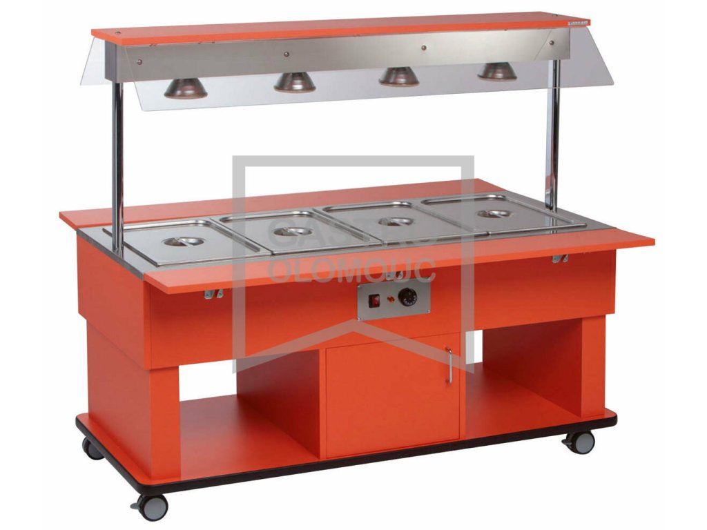 Vyhřívaný salátový bar HAPPY BM / INFRA se strukturou vrstveného dřeva. Horní rampa je vybavena infra osvětlením a pevným hygienickým zákrytem. Model je v pojízdném provedení (2 kola s brzdou). Nerezová nedělená vana BM (vodní lázeň, hloubka 180 mm) s vypouštěcím kohoutem a vybavena dvěma čelními sklopnými policemi. Snadné elektromechanické ovládání (termostat) pro nastavení teploty vany (+30°/+90 °C), horní rampa je doplněna o infračervené zářivky s nízkým příkonem (120 W) s nezávislým vypínačem a kontrolkou chodu. Zařízení v základu dodáváno bez výbavy GN (na vyžádání) a dalšího volitelného příslušenství.
