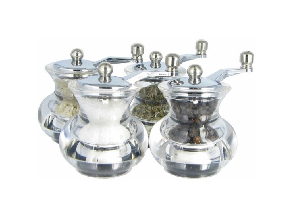 Setava mlýnků BOOGIE. V krabici mlýnek na sůl, mlýnek na pepř, mlýnek na bylinky a jeden prázdný mlýnek k naplnění. Mlýnky BOOGIE jsou akrylové mlýnky s kovovým mlecím mechanizmem. Výška mlýnků 7cm.Buďte první, kdo napíše příspěvek k této položce.