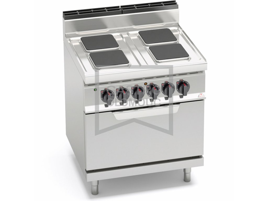 Sporák s troubou je vybaven varnými plotýnkami z litiny. Pracovní plochu lze doplnit o ocelovou výplň prostoru mezi plotnami, čímž se dosáhne celistvé pracovní plochy. Teplota je regulována nezávisle nastavitelnými spínači. Přímá kontrola teploty umožňuje významně uspořit energie. Topná tělesa jsou hermeticky uzavřena v jednom celku, který je lisován v rovině do varné desky. Pracovní plocha a opláštění z nerez oceli AISI 304. Litinová varné plotýnky s bezpečnostním termostatem a regulací výkonu. Kompaktní provedení s otevřeným podstavcem. Konvekční trouba vhodná pro GN 1/1, nebo model se statickou multifunkční troubou pro GN 2/1. Trouby mají nově zesílené litinové dno a jsou vybaveny kvalitním těsněním dveří.