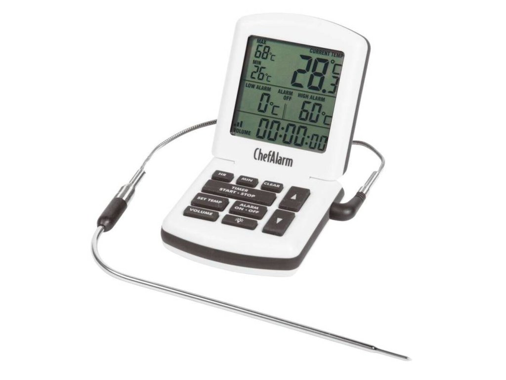 Digitální teploměr s odpojitelnou sondou. Teplotní rozsah od –50°C do +200°C, přesnost 0,1 °C.