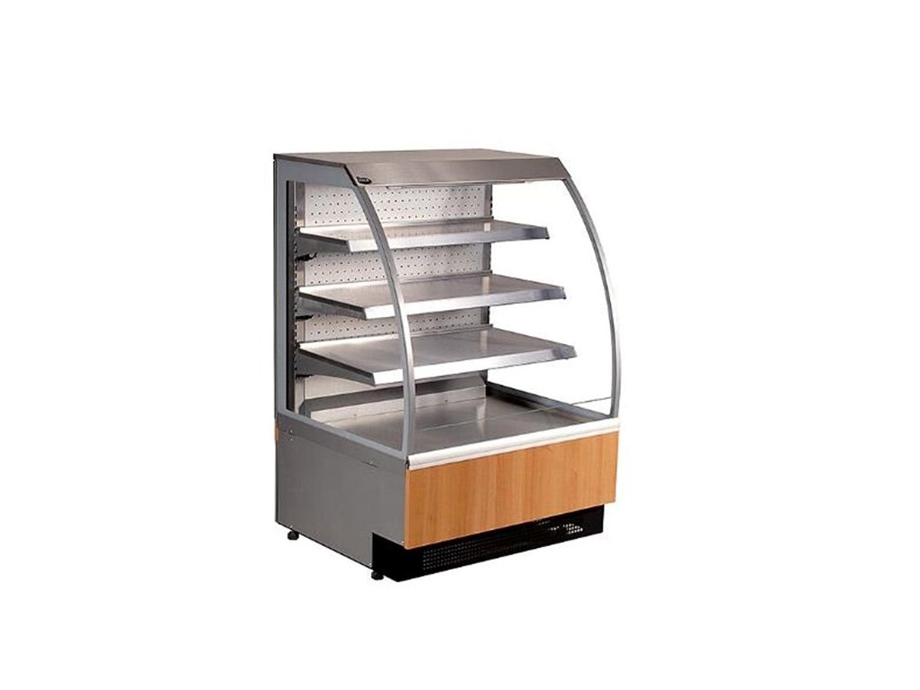 ventilované chlazení|vestavěný agregát|digitální termostat|automatické odtávání|3 nastavitelné skleněné chlazené police|bez čelního skla|boční izolační skla|LED osvětlení - barva bílá teplá|chlazená výstavní plocha nerezová|pevná záda